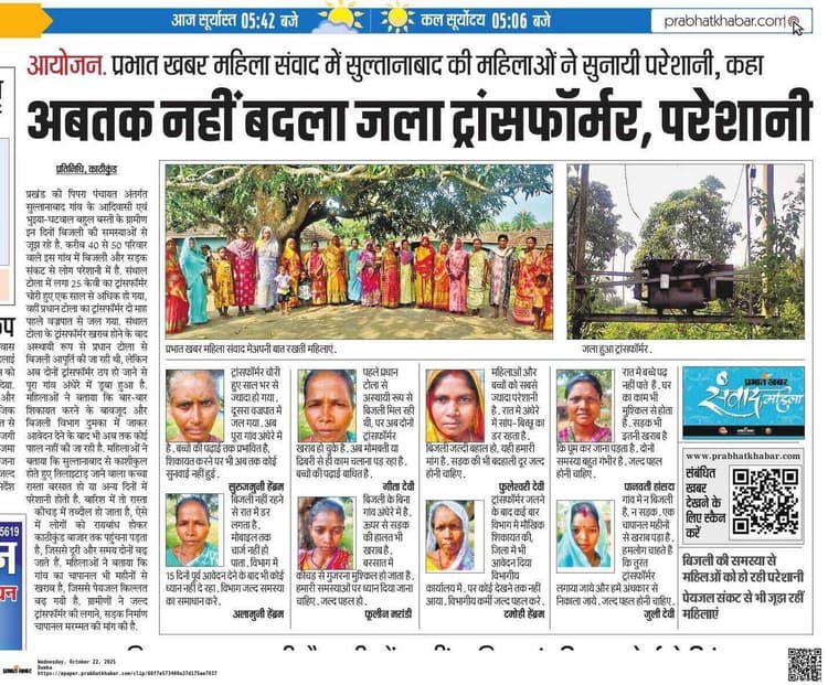 प्रभात खबर महिला संवाद में उठा था मुद्दा, विभागीय पदाधिकारियों ने लिया संज्ञान प्रतिनिधि, काठीकुंड प्रखंड की पिपरा पंचायत अंतर्गत सुल्तानाबाद गांव की बिजली समस्या आखिरकार दूर हो गयी. प्रभात खबर में 22 अक्तूबर को आयोजित महिला संवाद के दौरान महिलाओं ने अपनी विभिन्न परेशानियों को रखा था, जिसे प्रमुखता से प्रकाशित किया गया था. प्रमुख समस्या यह थी कि गांव में एक ट्रांसफॉर्मर चोरी तो दूसरा वज्रपात से जल चुका था और गांव बीते कई कई महीनों से अंधकार में थे. प्रकाशित समाचार का असर शुक्रवार को देखने को मिला. विभाग ने पहल करते हुए गांव में नया ट्रांसफॉर्मर स्थापित किया, जिससे महीनों से अंधेरे में डूबे ग्रामीणों के चेहरे पर फिर से रोशनी लौटी. गौरतलब है कि सुल्तानाबाद गांव के संथाल टोला में लगा 25 केवीए का ट्रांसफॉर्मर करीब एक साल पहले चोरी हो गया था. इसके बाद प्रधान टोला का ट्रांसफॉर्मर दो महीने पूर्व वज्रपात की चपेट में आकर जल गया था. दोनों ट्रांसफॉर्मर ठप होने से करीब 40 से 50 परिवार अंधेरे में रहने को विवश थे. एक बार फिर से बिजली आपूर्ति बहाल होने से ग्रामीणों के चेहरे पर खुशी लौट आयी है.