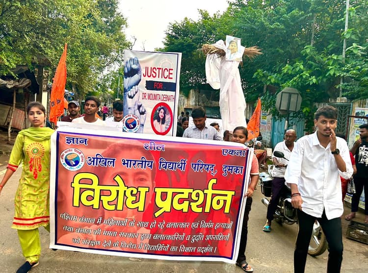 संवाददाता, दुमका कोलकाता में महिला चिकित्सक के साथ हैवानियत की हद को पार कर देने वाली घटना के विरोध में अभाविप दुमका नगर इकाई के द्वारा विरोध प्रदर्शन किया गया. पश्चिम बंगाल की मुख्यमंत्री ममता बनर्जी का पुतला दहन किया. नगर मंत्री अभिषेक गुप्ता के नेतृत्व में पुतला दहन के दौरान नगर सहमंत्री स्मृति ने कहा कि जिस प्रकार से कोलकाता के अस्पताल के अंदर महिला ट्रेनी डॉक्टर के साथ रेप कर उनकी निर्मम हत्या कर दी गयी और उनके पूरे शरीर के अंग को तोड़ा गया, ऐसी जघन्य कृत्य के दोषी को फांसी की सजा मिलनी चाहिए. इस राज्य की मुख्यमंत्री स्वयं महिला है, उस राज्य में महिलाओं के साथ बढ़ते अपराध अत्यंत चिंताजनक है. कहा कि टीएमसी के गुंडों द्वारा दुर्व्यवहार कर जबरन हॉस्पिटल में घुस कर सारे सबूतों को मिटा देना बंगाल की निकम्मी ममता बनर्जी की सरकार के करतूतों का परिचायक है. अपनी नाकामियों को छुपाने के लिए स्वयं के पास सारे मंत्री पद होते हुए धरना में बैठने की उनकी बात भी हास्यास्पद है कि आखिर ममता बनर्जी किनके खिलाफ धरना पर बैठेगी.अभाविप ने सरकार से मांग की कि जब तक दोषी पर वहां की सरकार कार्रवाई नहीं करती, स्पीडी ट्रायल दिलाकर सजा नहीं दिलाती, तब तक सड़क से सदन तक पुरजोर आंदोलन करेंगे. मौके पर जिला संगठन मंत्री धनंजय साह, प्रदेश कार्यकारिणी सदस्य मनोज सोरेन, लखीराम मंडल, नगर सह मंत्री सुमन कुमारी, बिनीता कुमारी, नेहा कुमारी, खुशी कुमारी, रवीना टंडन, प्रिया कुमारी, गायत्री कुमारी,प्रशांत रक्षित, अमन गुप्ता, राहुल चंद्रवंशी, साकेत जायसवाल, कॉलेज अध्यक्ष अमन कुमार साह, विवेक कुमार, अनीश कुमार, प्रिंस माही, अमन कुमार आदि कार्यकर्ता उपस्थित रहे.