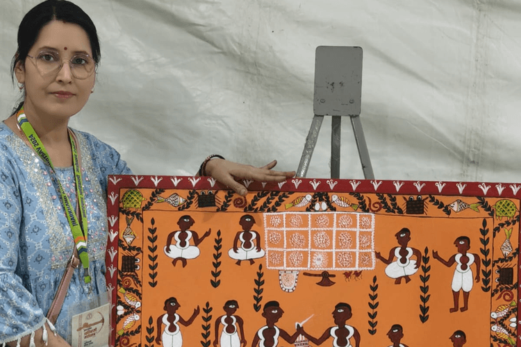 दुमका. विश्व आदिवासी दिवस पर रांची के बिरसा मुंडा स्मृति पार्क में आयोजित झारखंड आदिवासी महोत्सव में जादोपटिया चित्रकला शैली की नेशनल सीनियर फेलोशिप अवॉर्डी दुमका की चित्रकार नीलम नीरद और उनकी टीम के चित्रकारों की पेंटिंग ने गहरी छाप छोड़ी. इस महोत्सव के अवसर पर डॉ रामदयाल मुंडा जनजातीय शोध संस्थान द्वारा छह दिवसीय जनजातीय चित्रकला कार्यशाला-सह-प्रदर्शनी का आयोजन किया गया. इसमें झारखंड की चार चित्रकला शैलियों जादोपटिया, सोहराय, पटकर और खोहबर को विशेष रूप से प्रमोट किया गया. छत्तीसगढ़ की उरांव पेंटिंग और बीएचयू एवं शांति निकेतन के समकालीन चित्रकला शैली के कलाकारों ने भी आदिवासी जीवन, सामाजिक प्रथाओं और मूल्यों पर केंद्रित चित्र उकेरे. नीलम नीरद और उनकी टीम के अन्य सात कलाकारों ने जादोपटिया चित्रकला शैली के विभिन्न विषयों को नवोन्मेषी चाक्षुष प्रभाव के साथ बड़े कैनवास पर उतारा. नीलम नीरद की कलाकृतियों में संताल समाज के सोहराय पर्व और गोड़ टांडी अनुष्ठान के लयबद्ध दृश्यों को रैखिक गतिशीलता के साथ चित्रित किया गया, जिसमें रंग-संयोजन और रंग-संतुलन की विशिष्टता दिखी. इनकी एक अन्य कलाकृति में विशाल जलराशि के मध्य पृथ्वी की रचना और मनुष्य की उत्पत्ति की गाथा दर्शायी गयी है.