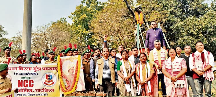 भगवान बिरसा मुंडा की विरासत और राष्ट्र निर्माण में आदिवासी समाज के योगदान का इतिहास नयी पीढ़ी तक पहुंचाने के लिए घाटशिला कॉलेज के एनसीसी कैडेटों ने बुधवार को बिरसा मुंडा पदयात्रा आयोजित की. इसे घाटशिला एसडीपीओ अजीत कुमार कुजूर और प्राचार्य डॉ आरके चौधरी ने कॉलेज के मुख्य द्वार पर हरी झंडी दिखायी. एनसीसी कैडेटों ने नारों, पर्चा-पोस्टर के माध्यम से बगवान बिरसा मुंडा के संघर्ष, उलगुलान आंदोलन और ब्रिटिश शासन के खिलाफ उनके नेतृत्व से अवगत कराया. बताया कि बिरसा मुंडा ने जनजातीय समाज को संगठित कर शोषण के विरुद्ध आवाज बुलंद की. राष्ट्रीय चेतना को मजबूत किया. उनकी विचारधारा युवाओं के लिए प्रेरणास्रोत है. विधायक, जिप सदस्य, केयू सीनेट सदस्य भी हुए शामिलएनसीसी अधिकारी लेफ्टिनेंट महेश्वर प्रमाणिक के संयोजन में आयोजित पदयात्रा में घाटशिला के विधायक सोमेश चंद्र सोरेन, जिप सदस्य देवयानी मुर्मू, कोल्हान विवि सीनेट सदस्य लखन मार्डी, प्रखंड प्रमुख सुशीला टुडू, मुखिया पार्वती सोरेन, झामुमो नेता जगदीश भकत, उप मुखिया रूपेश दुबे, प्रो इंदल पासवान समेत अन्य शामिल हुए.