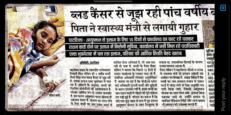सिद्रा नाज का इलाज एम्स भुवनेश्वर में चल रहा है. उसे नियमित कीमोथैरेपी की आवश्यकता है. परिवार आर्थिक रूप से बेहद कमजोर है. आयुष्मान भारत योजना का लाभ लेने के लिए बच्ची का नाम राशन कार्ड में जोड़ना अनिवार्य है. उसके पिता पिछले 15 दिनों से प्रखंड कार्यालय का चक्कर काट रहे हैं.डीसी के हस्तक्षेप से बढ़ी उम्मीद :