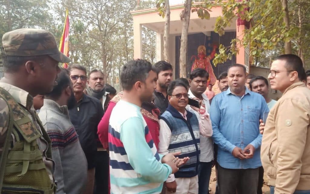 घटना को लेकर थाना में बैठक हुई. बजरंग दल के जिला संयोजक श्रवण सिंह, भाजपा के प्रखंड मंत्री संजीत भालुक, मंदिर कमेटी के विप्लव साव, कालू सिंह को पुलिस ने लिखित रूप से 48 घंटे में कार्रवाई का भरोसा दिया. इसी बीच विहिप नेता विकास सिंह, विजय सिंह पहुंच गये. तत्काल कार्रवाई की मांग पर नारेबाजी करते हुए थाना परिसर में बैठ गये. पुलिस ने नरसिंहगढ़ से धालभूमगढ़ तक चौक-चौराहा व मंदिर परिसर में रैफ के जवानों को तैनात कर दिया.