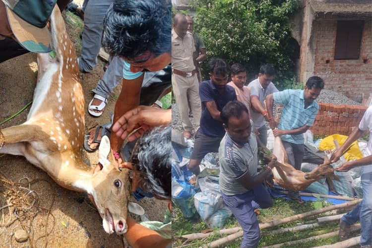 East Singhbhum News| मो परवेज: पूर्वी सिंहभूम जिले के घाटशिला शहर से सटे काशिदा में आज गुरुवार की सुबह जंगल से भटक कर एक हिरण पहुंच गया. हिरण को गांव में देखते ही आवारा कुत्तों ने उसे खूब दौड़ाया. इसी बीच मौके पर पहुंचे ग्रामीणों ने हिरण को बचाया और वन विभाग को इसकी सूचना दी.