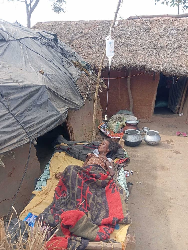 मुसाबनी. मुसाबनी प्रखंड के पारुलिया में शंख नदी तट पर स्थित सितुमपाल टोला के आदिम जनजाति के सबर परिवार बदहाली की जिंदगी जी रहे हैं. टोला में करीब डेढ़ दर्जन सबर परिवार हैं. टोला तक आवागमन के लिए सड़क नहीं है. सबर खेत की मेढ़ से होकर आवागमन करते हैं. टोला के सबरों को सरकारी चिकित्सा व्यवस्था का लाभ नहीं मिलता है. गायघाटा टोला की चांदी सबर बीमार है. उसका इलाज स्थानीय चिकित्सक से घर पर परिवार वाले करा रहे हैं. चांदी सबर के परिवार को अबतक आवास योजना का लाभ नहीं मिला है. उसका परिवार फूस की झोपड़ी पर प्लास्टिक टांग कर रह रहा है. परिवार में बेटा अशोक सबर, पुत्रवधू बेहुला सबर के साथ लखन सबर व लोबिन सबर हैं. परिवार वालों के मुताबिक, चांदी सबर एक माह से बीमार है. उसका इलाज स्थानीय डॉक्टर से कराया जा रहा है. झोपड़ी के पास खटिया पर चांदी सबर को लेटाकर एक लकड़ी पर बोतल टांग कर सेलाइन चढ़ाया जा रहा है. सोमवार की सुबह चिकित्सक आकर उसे इंजेक्शन लगाकर सेलाइन चला कर गया. सेलाइन खत्म होने पर खोल देने की बात कही है. चांदी सबर चलने-फिरने में असमर्थ है. उसकी हालत नाजुक है. अशोक सबर ट्रैक्टर पर मजदूरी कर परिवार का भरण पोषण करता है. परिवार की आर्थिक स्थिति ठीक नहीं है.