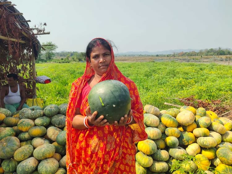 डुमरिया. डुमरिया प्रखंड की कुमड़ाशोल पंचायत के हातीबारी गांव निवासी झूमी कर तरबूज व कोहड़ा की खेती कर लखपति दीदी बन गयी हैं. तरबूज से उनका खेत भरा पड़ा है. इस बार तरबूज थोड़ा देर से निकला, लेकिन काफी मिठास होने के कारण 20 रुपये किलो हाथों हाथ बिक रहा है. एक- एक तरबूज आठ से दस किलो का है. व्यापारी खेत आकर तरबूज व कोहड़ा खरीदकर ले जा रहे हैं. कोहड़ा व लौकी का उत्पादन भी भरपूर हुआ है. उसे भी 10-15 रुपये किलो की दर से व्यापारी खेत से ले जा रहे हैं. झूमी कर कहती हैं इस खेती में पति शैलेंद्र कर पूरा सहयोग करते हैं. पहले पति ही छोटे आकार में खेती करते थे. कुछ साल से मैंने बेहतर खेती करने का जिम्मा उठाया. दुर्भाग्य से पहले साल पानी की कमी के कारण तरबूज सुखकर बर्बाद हो गया. इसमें लगभग 30 हजार रुपये का नुकसान हुआ. पर मैंने हिम्मत नहीं हारी. आगे भी खेती जारी रखी. आज बेहतर आमदनी हो रही है. लगभग तीन बीघे खेत में तरबूज की खेती की है. तरबूज व कोहड़ा के अलावे प्याज, खीरा, लौकी, बींस तथा टमाटर की खेती भी की है. खेती के लिए कहीं से प्रशिक्षण भी नहीं मिला है. विभाग की ओर से कोई प्रोत्साहन राशि भी नहीं मिली है. बस बेहतर खेती करने का जुनून तथा पति के सहयोग व प्रोत्साहन से यह संभव हो सका है. इन सबकी मिश्रित खेती से हर साल एक लाख से अधिक की कमाई कर लेती हैं.
