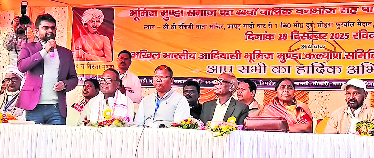 कालिकापुर. पोटका के सोहदा फुटबॉल मैदान में रविवार को अखिल भारतीय आदिवासी भूमिज-मुंडा कल्याण समिति, झारखंड के तत्वावधान में भूमिज-मुंडा समाज का 44वां वार्षिक वनभोज सह पारिवारिक मिलन समारोह का आयोजन किया गया. कार्यक्रम की शुरुआत परंपरागत पूजा-पाठ और विद-दिरि झंडोत्तोलन से हुई. इस अवसर पर खेलकूद, सांस्कृतिक कार्यक्रम और समाजिक परिचर्चा का भी आयोजन हुआ. मुख्य अतिथि के रूप में पोटका विधायक संजीव सरदार, तथा विशिष्ट अतिथि के रूप में पूर्व विधायक मेनका सरदार मौजूद रहीं. विधायक संजीव सरदार ने कहा कि समिति चार दशक पुरानी संगठन है जो समाज को संगठित कर आगे बढ़ाने का कार्य कर रही है. विधायक ने वार्षिक वनभोज सह पारिवारिक मिलन समारोह-2025 के अवसर पर हजारों लोगों के बीच मांदर और नगाड़ा बजाकर लोगों को समाज के संस्कृति से जुड़े रहने का संदेश दिया. उन्होंने कहा कि अब जब राज्य सरकार ने पांचवीं अनुसूचित क्षेत्र में पेसा कानून लागू करने की मंजूरी दी है, तब समाजिक संगठनों की जिम्मेदारी है कि पारंपरिक स्वशासन व्यवस्था को गांव स्तर से मजबूत करें ताकि समाज को अधिकार मिले. उन्होंने जानकारी दी कि 2 जनवरी 2025 को टीसीसी सोनारी में एक दिवसीय कार्यशाला आयोजित की जायेगी, जिसमें पेसा के तहत ग्राम व्यवस्था लागू करने पर विचार-विमर्श होगा. संजीव सरदार ने कहा कि संगठन कोल्हान क्षेत्र में एकजुटता के प्रयास में है और हर इलाके में धुमकुड़िया भवन निर्माण की योजना पर काम हो रहा है. उन्होंने समाज से वीर शहीद गंगा नारायण सिंह की जयंती आगामी वर्ष गोपाल मैदान, जमशेदपुर में धूमधाम से मनाने की अपील की और कहा कि कार्यक्रम में लगभग पचास हजार प्रतिभागियों की भागीदारी सुनिश्चित की जायेगी. पूर्व विधायक मेनका सरदार ने अपने संबोधन में समाज को एकता व जागरूकता बनाए रखने और सामूहिक विकास के लिए कार्य करने का संदेश दिया. मौके पर मुख्य रूप समाजसेवी बिभीषन सिंह भूमिज, कामला कांत सिंह मुंडा, शरद सिंह सरदार, मंगल सिंह मुंडा, मदन सिंह मुंडा, शाहेबराम सिंह मुंडा, विश्वनाथ सिंह सरदार, बहादुर सिंह मानकी, सुधाकर सिंह सरदार, लालबाबू सरदार, दिनेश चंद्र सरदार, शिव शंकर सिंह, सुजाता सिंह आदि उपस्थित थे.