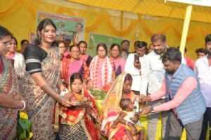 पटमदा. पटमदा प्रखंड के बनकुंचिया, ओड़िया और खेड़ुआ पंचायत सचिवालयों में गुरुवार को प्रशासन की देखरेख में ‘सरकार आपके द्वार’ शिविर का आयोजन हुआ. खेड़ुआ पंचायत में आयोजित मुख्य शिविर का उद्घाटन विधायक मंगल कालिंदी ने दीप प्रज्ज्वलित कर किया. विधायक कालिंदी ने कहा कि यह कार्यक्रम सरकार की योजनाओं को सीधे जनता तक पहुंचाने का प्रभावी माध्यम है. शिविर में जाति, आय, निवास प्रमाणपत्र सहित विभिन्न दस्तावेज मौके पर ही बनाये गये. साथ ही गोद भराई, बच्चों का मुंहजूठी, धोती-साड़ी वितरण, सावित्रीबाई फुले किशोरी समृद्धि योजना, वृद्धा पेंशन स्वीकृति प्रमाणपत्र वितरण एवं महिला समूहों को परिसंपत्तियां दी गयी. शिविर में विभिन्न विभागों के स्टॉल लगाए गए, जहां अधिकारियों ने ग्रामीणों की समस्याएं सुनकर मौके पर समाधान किया. कार्यक्रम में बीडीओ शशि नीलिमा डुंगडुंग, सीओ डॉ. राजेंद्र कुमार दास, सीडीपीओ सुनीता केरकेट्टा, बीएओ देव कुमार, जिला पार्षद प्रदीप बेसरा, विधायक प्रतिनिधि चंद्रशेखर टुडू, मुखिया गंगाधर सिंह, अश्विनी महतो और कालीपद महतो उपस्थित थे.पटमदा : माधवपुर व मुकरुडीह में महिला समूहों में चेक वितरित