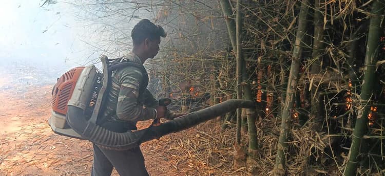 चाकुलिया. चाकुलिया वन क्षेत्र स्थित चौठिया के जंगल में शुक्रवार को शरारती तत्वों ने सूखे पत्तों में आग लगा दी. दिनभर चल रही तेज हवाओं ने आग में घी का काम किया, जिससे देखते ही देखते पूरा जंगल आग की लपटों की चपेट में आ गया. आग की भयावहता इतनी अधिक थी कि चौठिया ऊपर टोला के कई घर इसकी जद में आने से बाल-बाल बचे. ग्रामीणों में अफरा-तफरी मच गयी. लोग अपने घरों के बोरिंग से पानी लेकर आग बुझाने और अपने आशियानों को बचाने का प्रयास करने लगे. सूचना मिलने पर वन विभाग की क्यूआरटी टीम विंड ब्लोअर लेकर मौके पर पहुंची, लेकिन तेज हवा के कारण सूखे पत्तों से आग बुझाने में उन्हें सफलता नहीं मिली. अंततः बहरागोड़ा से दमकल विभाग की गाड़ी बुलायी गयी, जिसके बाद आग पर काबू पाया जा सका.