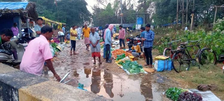 गालूडीह. शनिवार शाम को झमाझम बारिश शुरू होने से खड़िया कॉलोनी साप्ताहिक हाट दलदल में तब्दील हो गयी. यहां बारिश के पानी की निकासी के लिए नाली नहीं होने से हाट स्थल में जगह-जगह पानी थम गया. पानी और कीचड़ की वजह से सब्जी विक्रेताओं को दुकान लगाने के लिए भी साफ जगह नसीब नहीं हुई. कई स्थानों पर फिसलन की स्थिति बन गयी थी.ऐसे में किसानों को कीचड़ में ही दुकान लगाकर सब्जी बेचनी पड़ी. दुकानदारों ने बताया कि हर बार बारिश में परेशानी के बीच में हाट में दुकान लगाकर सब्जियों को औने-पौने दाम में बेचना पड़ता है. हाट में दस रुपये में तीन किलोग्राम टमाटर और पांच रुपये में फूल गोभी बिक रही थी. जिससे किसानों को काफी नुकसान हुआ.