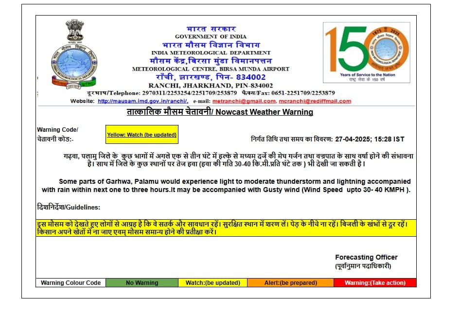 मौसम विभाग ने आज रविवार की दोपहर में चेतावनी जारी की थी कि झारखंड के पलामू और गढ़वा जिले में अगले एक से तीन घंटे में तेज हवाओं के साथ बारिश होगी. इस दौरान गरज के साथ वज्रपात भी हो सकता है. इस बाबत येलो अलर्ट जारी किया गया था.