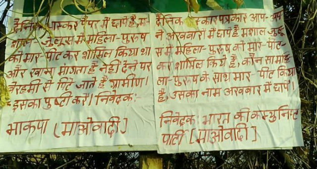 पोस्टर में यह लिखा गया है कि एक दैनिक अखबार में यह खबर छपी थी कि मशाल जुलूस में शामिल होने के लिए नक्सलियों ने ग्रामीणो को पीटा है. पोस्टर में यह बात लिखी गयी है कि ग्रामीणों को आगे आकर बताना चाहिए कि उन्हे किसने मशाल जुलूस में शामिल होने के लिए मारा-पीटा है.