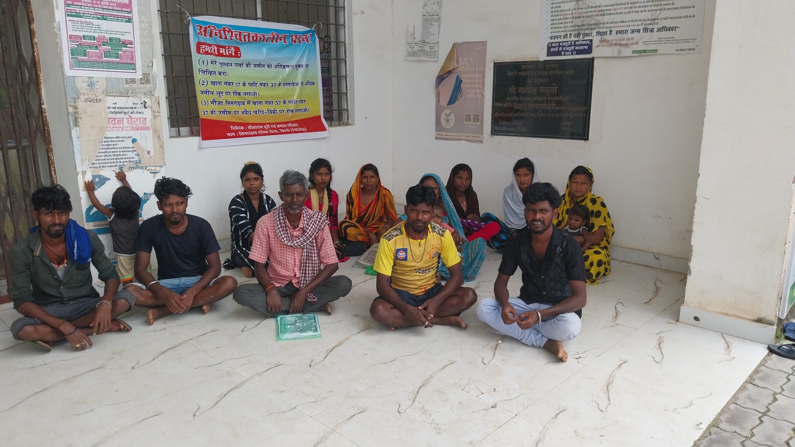 बिरनी प्रखंड मुख्यालय के पीछे सिमराढाब हरिजन कॉलोनी निवासी सीताराम तुरी को अंचल कार्यालय बिरनी से न्याय नहीं मिलने की बात कहते हुए परिवार के साथ सोमवार को प्रखंड सह अंचल कार्यालय के बाहर मुख्य गेट के पास अनिश्चितकालीन धरना पर बैठ गये. अनिश्चितकालीन धरना की सूचना प्रखंड प्रमुख रामू बैठा को दी गयी. सूचना मिलते ही प्रमुख ने सीओ संदीप मधेसिया के जिला मीटिंग में चले जाने की सूचना मिलने के बाद प्रभारी सीआई सह राजस्व कर्मचारी पंचानन राय से कहा कि अगर अंचल से समय पर काम हुआ रहता तो शायद सीताराम तुरी को पूरे परिवार के साथ अनिश्चितकालीन धरना पर बैठने की जरूरत नहीं पड़ती. इस मामले को अविलंब निष्पादन करें पंचानन राय ने एक सप्ताह के अंदर मामले को निष्पादन करने की बात कहा और सीताराम तुरी के भाई कार्तिक तुरी को तत्काल नोटिस देकर विवादित जमीन पर किसी तरह का काम नहीं करने की बात कही. इसके बाद पूरा परिवार तीन घंटे के बाद धरना को खत्म कर दिया.