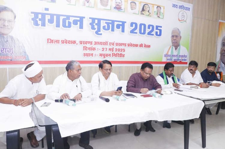 Giridih News : मधुबन में जिला कांग्रेस कमेटी द्वारा संगठन सृजन 2025 को लेकर मंगलवार को बैठक की गयी. इसमें सभी प्रखंड अध्यक्ष, मंडल अध्यक्ष, प्रखंड पर्यवेक्षक, जिला पर्यवेक्षक आदि शामिल हुए. बतौर मुख्य अतिथि अखिल भारतीय कांग्रेस कमेटी के कार्यसमिति सदस्य और झारखंड राज्य के प्रभारी के राजू, विशिष्ट अतिथि के रूप में सह प्रभारी बेला प्रसाद व प्रदेश अध्यक्ष केशव महतो कमलेश मौजूद रहे. बैठक से पहले मधुबन के मध्य लोक संस्थान में स्वातिमती माताजी के 101 वें अवतरण दिवस पर आयोजित कार्यक्रम में श्री के राजू बतौर मुख्य अतिथि शामिल हुए और माता जी का आशीर्वाद प्राप्त किया. इसके बाद मधुबन गेस्ट हाउस में पंडित जवाहरलाल नेहरू की पुण्यतिथि के अवसर पर उनकी तस्वीर पर माल्यार्पण कर श्रद्धांजलि अर्पित की. इसके बाद बैठक में सभी प्रखंड अध्यक्षों व मंडल अध्यक्षों से संगठन की अद्यतन जानकारी ली और आने वाले समय में संगठन सृजन के लिए किये जाने वाले कार्यों के लिए दिशा निर्देश दिया. इस अवसर पर कार्यकर्ताओं को संबोधित करते हुए प्रभारी के राजू ने कहा कि कांग्रेस पार्टी आज देश की सबसे पुरानी पार्टी है. जिसने कभी भी किसी जाति विशेष की नहीं बल्कि संपूर्ण समाज को साथ लेकर चलने की राजनीति की है. सह प्रभारी बेला प्रसाद ने कहा कि हमारे कार्यकर्ता मजबूत हैं. संगठन केवल चुनाव लड़ने के लिए नहीं होता. संगठन को मजबूत करने की जरूरत इसलिए है कि हमें जनता के हक की लड़ाई लड़नी है.
