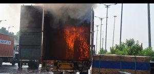 Giridh News :कंटेनर ने ट्रक में पीछे से मारा धक्का, आग लगने से लाखों के फ्रीज जले