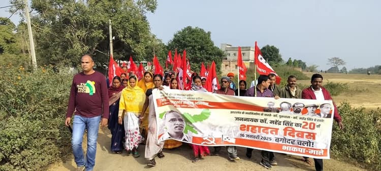 शहीद कामरेड महेंद्र सिंह के 20वें शहादत दिवस पर बगोदर बस पड़ाव में आयोजित जन संकल्प सभा को लेकर जोहार झारखंड संकल्प यात्रा का आयोजन किया गया. इसमें औरा पंचायत में यात्रा निकाली गयी. यात्रा औरा पंचायत के पथलडीहा गांव से शुरू होकर दामा होते हुए औरा बाजार पहुंची और नुक्कड़ सभा में तब्दील हो गयी. पैदल मार्च में पूर्व विधायक विनोद कुमार सिंह भी मौजूद थे. पूर्व विधायक विनोद कुमार सिंह ने कहा कि आम जनता के लिए सचमुच का नया साल 16 जनवरी शहादत दिवस से ही शुरू होता है. इस दौरान लोकतंत्र, संविधान, धर्मनिरपेक्षता को बुलंद करने और आम लोगों की दावेदारी को आगे बढ़ाने के लिए बगोदर आने की अपील की गयी. यात्रा में प्रखंड सचिव परमेश्वर महतो, पूर्व जिप सदस्य गजेंद्र महतो, उप प्रमुख हरेंद्र कुमार सिंह, कुमोद यादव, राजू रजक, त्रिभुवन महतो, धानेश्वर महतो, भुनेश्वर महतो, शम्भू महतो, भगिया देवी, यशोदा देवी, पंसस हेमिया देवी, नेमिया देवी, रूपा देवी, माला कुमारी, जियाउल अंसारी, इस्राइल अंसारी, अरसद अंसारी, संजय पटेल आदि मौजूद थे.माले की संकल्प पदयात्रा शुरू