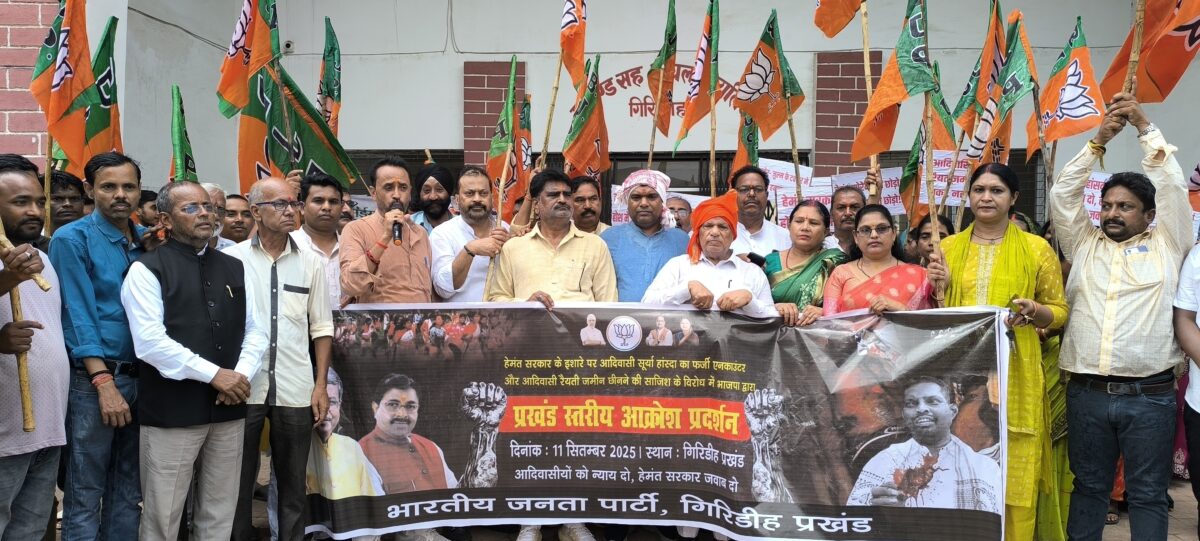 Giridih News :भाजपाइयों ने आदिवासी नेता सूर्या हांसदा के एनकाउंटर की सीबीआई जांच कराने और नगड़ी के आदिवासी रैयत से रिम्स-टू के लिए जमीन छीनने की साजिश का आरोप लगाते हुए गुरुवार को सदर प्रखंड मुख्यालय में आक्रोश प्रदर्शन किया. इसका नेतृत्व भाजपा जिलाध्यक्ष महादेव दुबे ने किया.
