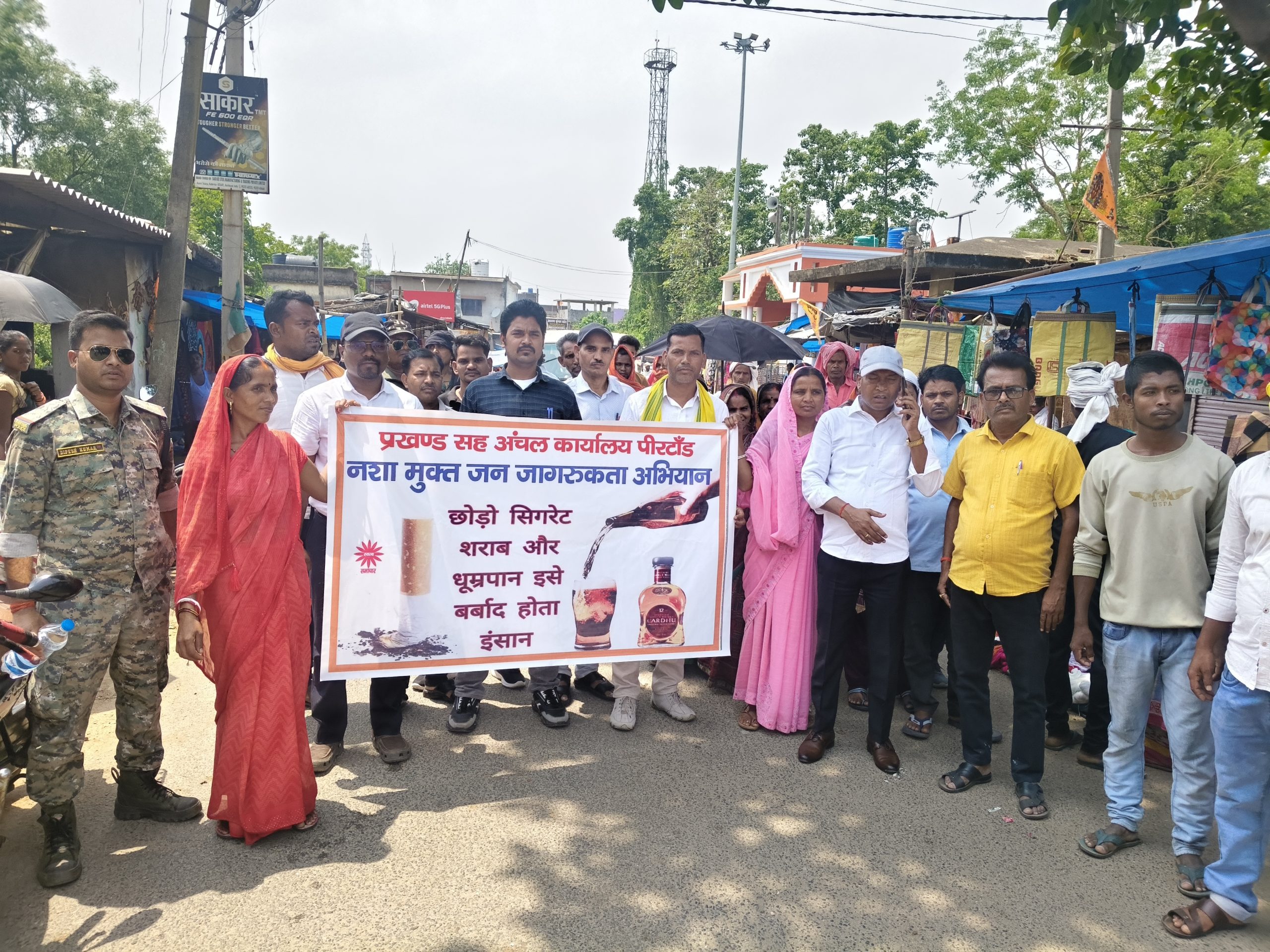 प्रखंड मुख्यालय पीरटांड़ से चिरकी के बिनोदधाम तक गुरुवार को नशा मुक्त जनजागरूकता अभियान चलाया गया. इस दौरान बीडीओ मनोज मरांडी, सीओ गिरजानंद किस्कू एवं थाना प्रभारी दीपेश कुमार मुख्य रूप से शामिल हुए. प्रखंड मुख्यालय परिसर से चिरकी बाजार, हटिया होते हुए बिनोदधाम तक लोगों को नशा मुक्ति को लेकर जागरूक किया गया. विदित हो कि बुधवार को बिनोदधाम परिसर के आसपास शराब बिक्री पर रोक लगाने आदि को लेकर बीडीओ एवं सीओ से अतिक्रमण हटाने की मांग की गयी थी. मौके पर ओमप्रकाश महतो सहित प्रखंड के कर्मी एवं स्थानीय लोग मौजूद थे.