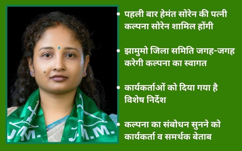 स्थापना दिवस कार्यक्रम में पहली बार पूर्व मुख्यमंत्री हेमंत सोरेन की पत्नी कल्पना सोरेन शामिल होंगी. झामुमो जिला समिति उनका जगह-जगह भव्य स्वागत करेगी. उनके आगमन को लेकर कार्यकर्ताओं को विशेष रूप से निर्देशित किया गया है. श्रीमती कल्पना के संबोधन को सुनने के लिए कार्यकर्ता व समर्थक बेसब्री से इंतजार कर रहे हैं.