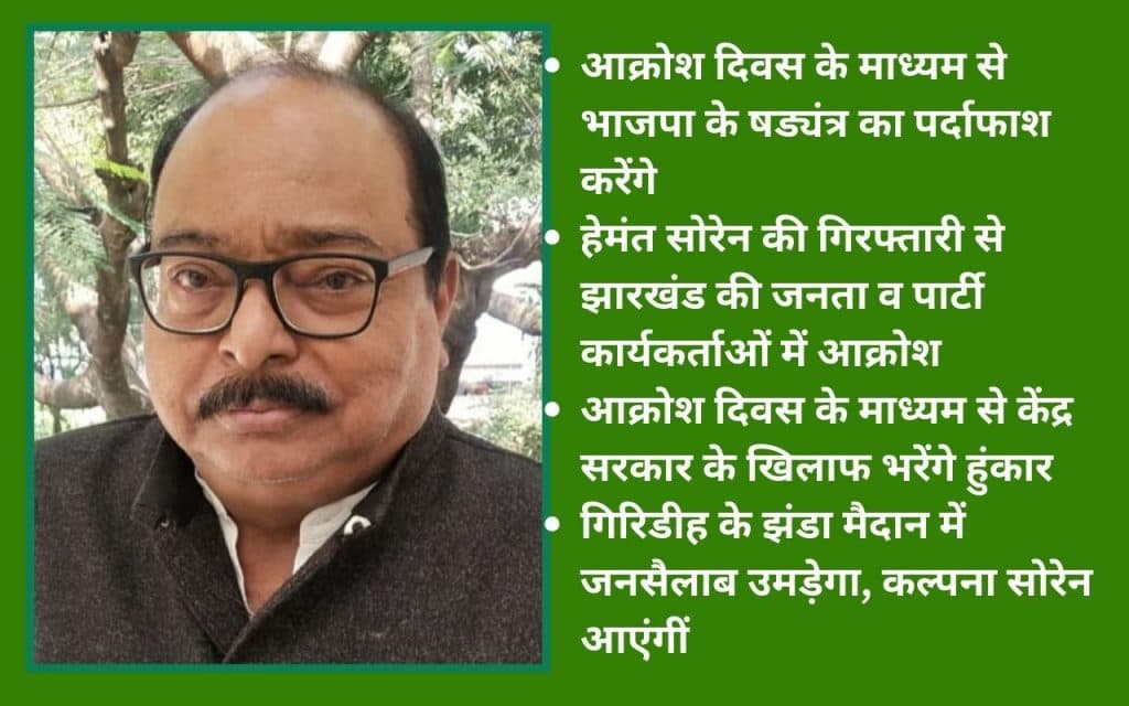गांडेय के पूर्व विधायक डॉ सरफराज अहमद ने कहा कि आक्रोश दिवस के माध्यम से भाजपा के षड्यंत्र का पर्दाफाश किया जायेगा. पूर्व मुख्यमंत्री हेमंत सोरेन की गिरफ्तारी से झारखंड की जनता व पार्टी कार्यकर्ताओं में काफी आक्रोश है. कार्यक्रम के माध्यम से केंद्र सरकार के खिलाफ हुंकार भरा जायेगा.