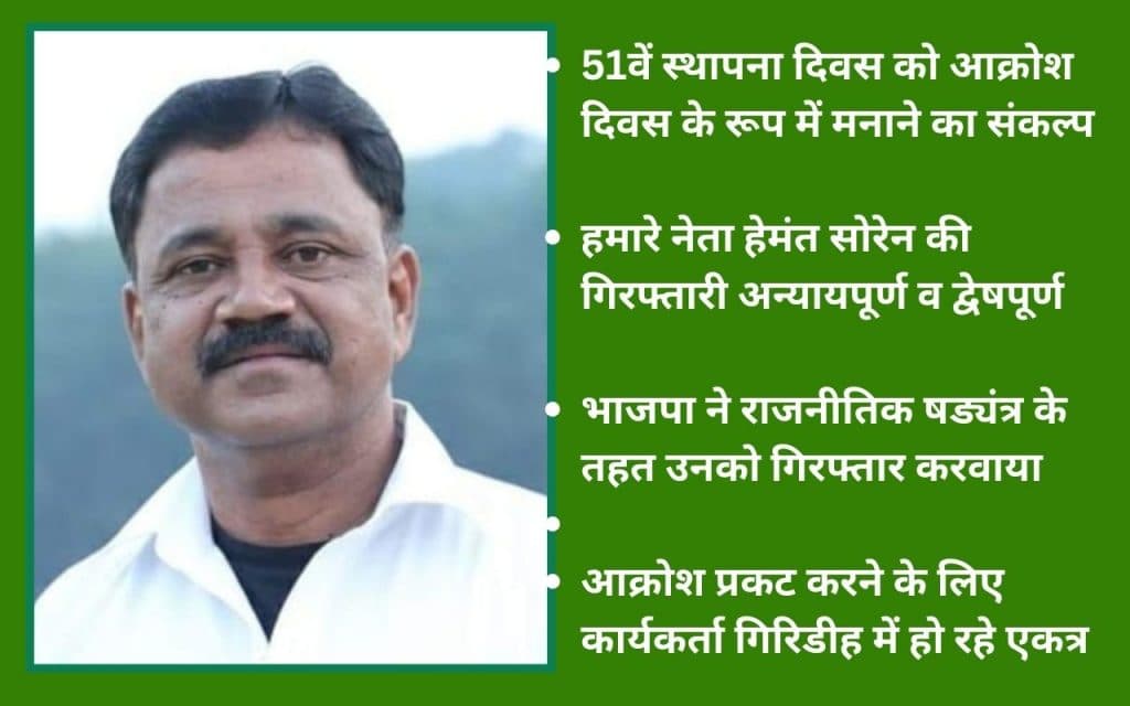 विधायक सुदिव्य कुमार सोनू ने कहा कि झामुमो के 51वें स्थापना दिवस को आक्रोश दिवस के रूप में मनाने का संकल्प कार्यकर्ताओं ने लिया है. झामुमो कार्यकर्ता व झारखंड की जनता यह मानती है कि हमारे नेता हेमंत सोरेन की गिरफ्तारी अन्यायपूर्ण व द्वेषपूर्ण है. भाजपा ने राजनीतिक षड्यंत्र के तहत उनकी गिरफ्तारी करवायी है.