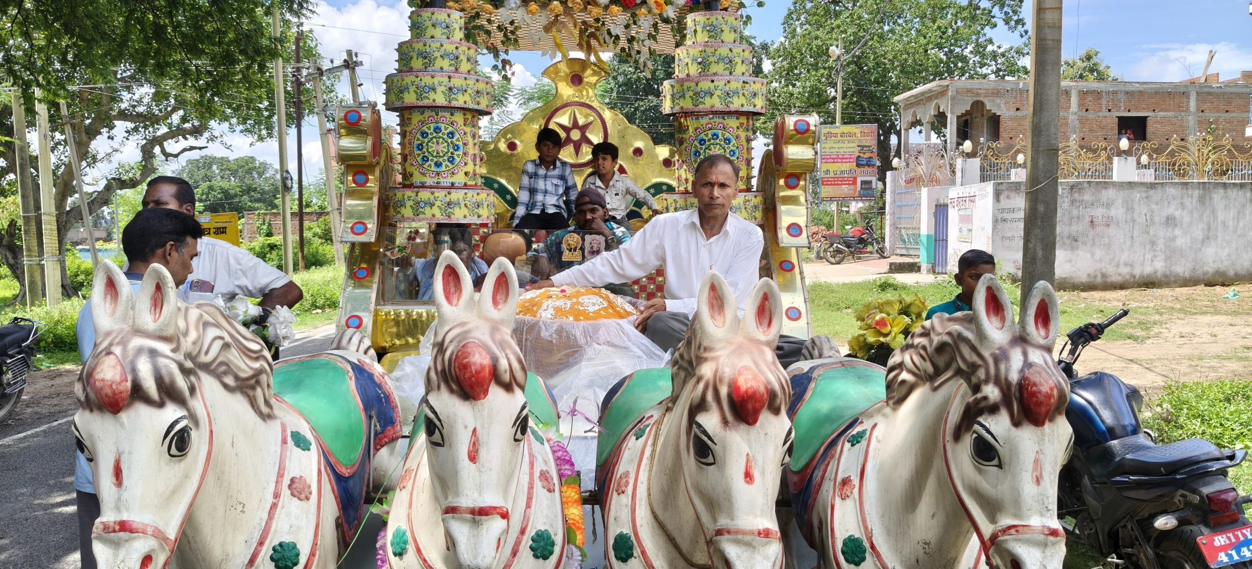 तिसरी प्रखंड मुख्यालय स्थित गांधी मैदान में नवयुवक समिति द्वारा आयोजित गणेश महोत्सव की शुरुआत बुधवार को भगवान श्री गणेश की भव्य प्रतिमा का अनावरण व पूजा के साथ हुई. साथ ही पांच दिवसीय मेला की भी शुरुआत हुई. इसमें कई तरह के झूले और दुकानें लगायीं गयीं हैं. बुधवार को पूजा के पूर्व समाजसेवी राजू शर्मा के सौजन्य से चार घोड़े के बने रथ पर 51 किलो के लड्डू को रखकर नगर भ्रमण किया गया. फिर लड्डू को श्री गणेश जी की प्रतिमा के सामने रख पूजा की गयी. आयोजन में पूजा समिति के अध्यक्ष राहुल यादव, मुकेश प्रजापति, उदय यादव, रंजन यादव, यशवंत सिंह, प्रवीण सिंह, कुंदन सिंह, सोनू पाठक, मोनू पाठक, नितेश सिन्हा, पप्पू यादव, आकाश साह, सत्यम उपाध्याय, आर्यन सिन्हा, नितेश यादव, अजय यादव, प्रशांत गुप्ता आदि सक्रिय हैं.डिस्क्लेमर: यह प्रभात खबर समाचार पत्र की ऑटोमेटेड न्यूज फीड है. इसे प्रभात खबर डॉट कॉम की टीम ने संपादित नहीं किया है