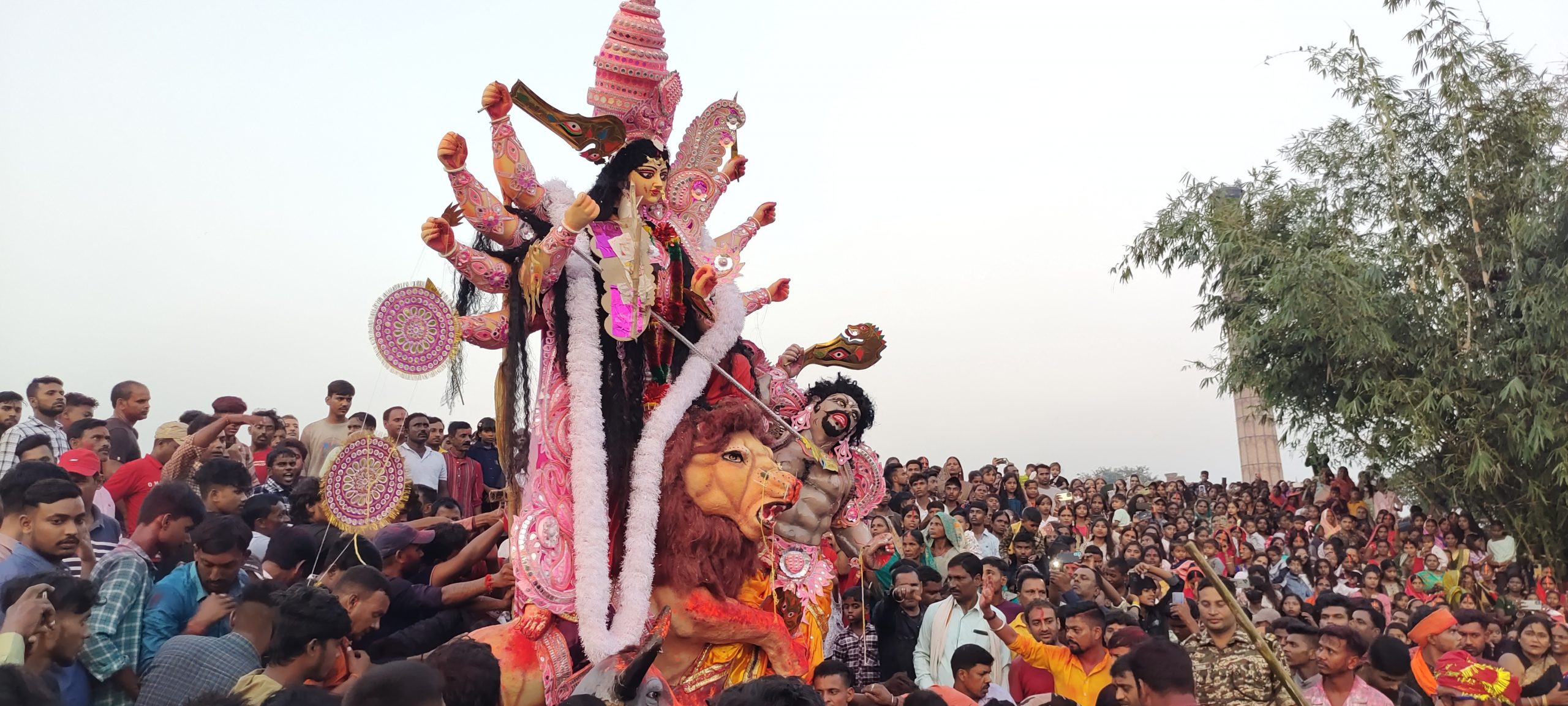 बनियाडीह में कंधे पर मां दुर्गा की प्रतिमा को ले जाकर पंपू तालाब में किया गया विसर्जन