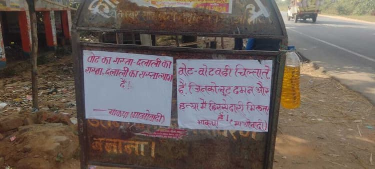 दूसरे चरण के विधानसभा चुनाव से पहले पीरटांड़ के गिरिडीह-डुमरी मुख्य सड़क पर पालगंज मोड़ में भाकपा माओवादी ने पोस्टर चिपका कर वोट नहीं देने की अपील की है. बहुत दिनों के बाद माओवादी ने पोस्टर चिपकाकर अपनी उपस्थिति दर्ज करायी है. मोड़ पर दो पोस्टर चिपकाया गया है. भाकपा माओवादियों ने लिखा है कि वोट का रास्ता दलाली का रास्ता, दलाली का रास्ता त्याग दें. साथ ही दूसरे पोस्टर में लिखा है वोट वोट वहीं चिल्लाते हैं, जिनको लूट, दमन हत्या में हिस्सेदारी मिलता है. सूचना पर प्रशासन ने पोस्टर को उखाड़ दिया.