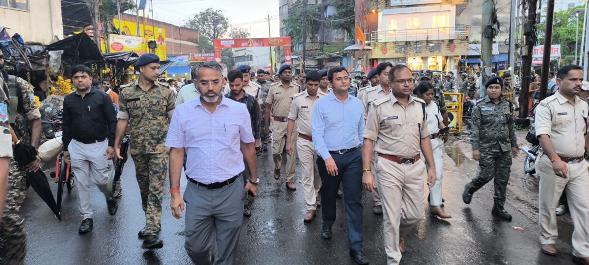 Giridih news: दुर्गापूजा को देखते हुए जिला प्रशासन और पुलिस अलर्ट है. शनिवार की शाम बारिश के बीच शहर में पुलिस व प्रशासन ने संयुक्त रूप से फ्लैग मार्च निकाला. मार्च का नेतृत्व डीसी रामनिवास यादव व एसपी डॉ विमल कुमार ने किया.