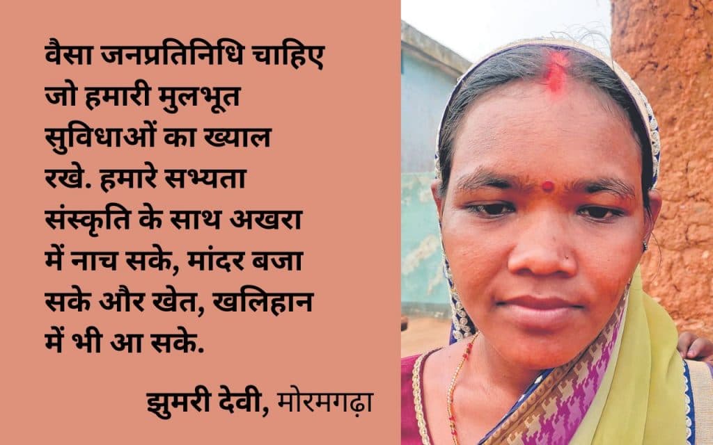 मोरमगढ़ा की झुमरी देवी ने कहा कि वैसा जनप्रतिनिधि चाहिए जो हमारी मुलभूत सुविधाओं का ख्याल रखे. हमारे सभ्यता संस्कृति के साथ अखरा में नाच सके, मांदर बजा सके और खेत, खलिहान में भी आ सके. हमें शिक्षा, स्वास्थ्य के साथ पहले सड़क की जरूरत है.