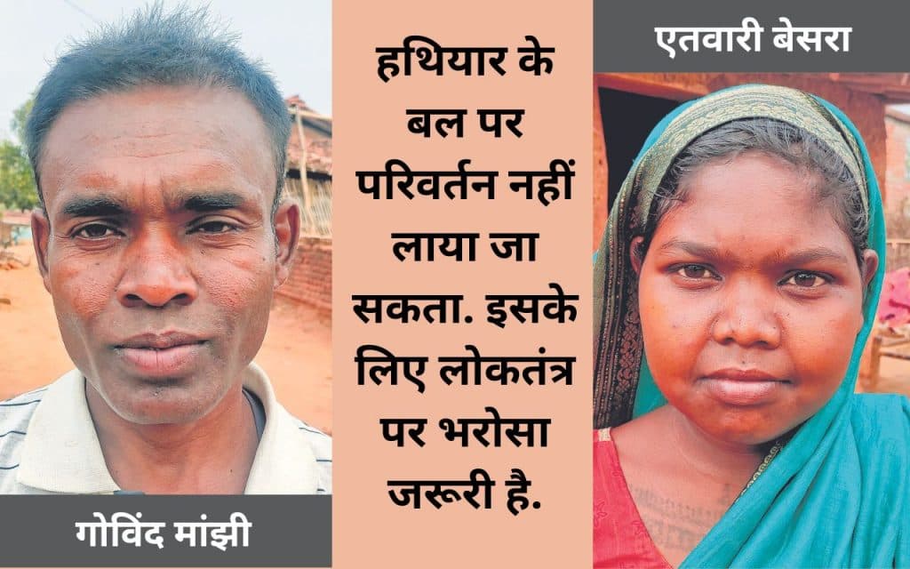 गोविंद मांझी व एतवारी बेसरा का कहना था कि हथियार के बल परिवर्तन नहीं लाया जा सकता. इसके लिए लोकतंत्र पर भरोसा जरूरी है, पर बाबुओं पर नियंत्रण रखना होगा, ताकि किसी का काम नहीं रुके. अब घुसखोरी की संस्कृति नहीं चलनी चाहिए.