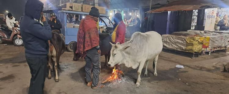 तस्वीर:- 43 अलाव सहारा ले रहे मवेशी व राहगीर. प्रतिनिधि, गोड्डा गोड्डा जिले में इन दिनों कड़ाके की ठंड पड़ रही है. ठंड से बचने के लिए मवेशी भी आग का सहारा ले रहे हैं. कुछ ऐसा ही नजारा गोड्डा के कारगिल चौक में देखने को मिला. जहां देर शाम में कुछ लोग आग सेंक रहे थे, इसी दौरान कुछ आवारा मवेशी भी कांपते हुए आग के पास पहुंच गया. वहीं खड़े होकर आग सेंकने लगा. गोड्डा में राहगीरों व दुकानदारों को ठंड से राहत पाने के लिए अलाव का सहारा लेना पड़ रहा है. शहर में कुछ लोग आग सेंक रहे थे, इसी दौरान आवारा पशु भी वहां पर आकर अपनी जगह बना कर आग सेंकते दिखाई दिए. जब तक ठंड दूर नहीं हो रही हैं, अलाव के पास ही डटे रह रहे हैं. शहर में ठंड के चलते आम जनजीवन अस्त-व्यस्त है. लोग घरों से निकलने से कतरा रहे हैं. यहां तक की ठंड से बचने के लिए लोग चाय और सिगरेट का सहारा ले रहे हैं.