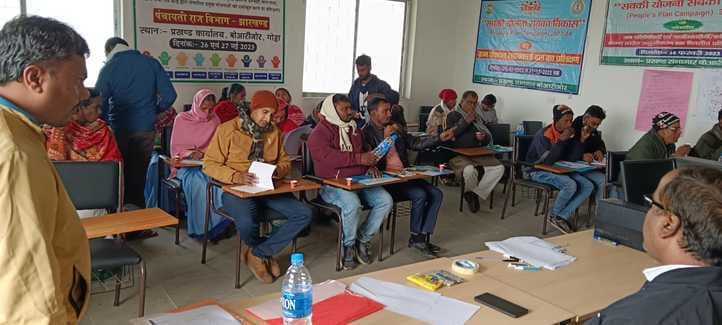 बोआरीजोर प्रखंड के प्रशिक्षण भवन में सहजकर्ता दल के दूसरे दिन का प्रशिक्षण संपन्न हो गया. प्रशिक्षक सेबेस्तियन ने बताया कि योजना का चयन ग्राम सभा द्वारा किया जाना चाहिए और योजना से अधिक से अधिक ग्रामीण को लाभ मिले, इस पर ध्यान देना आवश्यक है. उन्होंने कहा कि गैर आवासीय प्रशिक्षण हो रहा है. प्रशिक्षण के दौरान जानकारी प्राप्त कर ग्रामीण के बीच साझा करें, ताकि योजना के चयन में ग्रामीण भी मदद करें. उन्होंने योजना के चयन को लेकर प्रोजेक्टर के माध्यम से विस्तार से जानकारी दिया. कहा कि सरकार का मुख्य उद्देश्य है कि सुदूर गांव का विकास किया जाये एवं विकास की किरण सुदूर गांव तक पहुंच सके. मौके पर निर्मल भगत, शशिधर यादव, सुरेश मरांडी आदि उपस्थित थे.