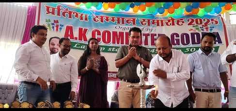गोड्डा शहर के ऐके कंप्यूटर असनबनी की ओर से लोहियानगर विवाह भवन 10वीं व 12वीं परीक्षा में बेहतर सफलता पर छात्र-छात्राओं को सम्मानित किया. कार्यक्रम के मुख्य अतिथि एसडीओ बैधनाथ उरांव, विशिष्ट अतिथि झारखंड राज्य अल्पसंख्यक आयोग के सदस्य हाजी इकरारूल हसन आलम, डॉ जुनैद एवं दिशा पब्लिक स्कूल के संस्थापक कामरान जलील ने संयुक्त रूप से दीप जलाकर कार्यक्रम का उदघाटन किया. क्रम में बच्चों को अतिथियों के हाथों लेपटॉप एवं मोमेंटो देकर सम्मानित किया गया. एसडीओ श्री उरांव ने कहा कि बच्चों की प्रतिभा से वे काफी खुश हैं. गोड्डा में कार्यक्रम का आयोजन बच्चों को आगे बढ़ाने में मदद करता है. वहीं श्री आलम ने कहा कि नयी पीढी को आगे बढ़ाने में सभी के सहयोग की जरूरत है. अगर लोग सहयोग करते हैं, तो आगे भी बच्चों का रिजल्ट बेहतर होगा. मौके पर ईआर कमल, मो अजहर, मुफ्ती अयाज़, असद, प्रकाश मरांडी, रमजान अंसारी, संजय कुमार, मो इम्तियाज़, मो फिरोज, मो शमशाद, इलियास आदि शिक्षक उपस्थित थे.
