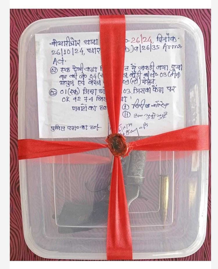 बोआरीजोर. बोआरीजोर थाना अंतर्गत प्राथमिक विद्यालय कोटिका के पास मोटरसाइकिल की सीट के नीचे रखे अवैध लोडेड देसी कट्टा बरामद किया गया है. थाना प्रभारी विजय केरकट्टा ने बताया कि शनिवार की शाम 6.30 बजे विधानसभा चुनाव को ध्यान में रखते हुए वरीय पुलिस पदाधिकारी के निर्देश पर मतदान केंद्र का निरीक्षण के लिए पुलिस के द्वारा क्षेत्र में भ्रमण किया जा रहा था. इस दौरान प्राथमिक विद्यालय कोटिका के पास पुलिस की गाड़ी को देखकर तेज गति से आ रहे मोटरसाइकिल सवार बीच सड़क पर बाइक घूमा कर भागने की कोशिश करने लगे. मोटरसाइकिल फिसल जाने से सवार सड़क पर गिर गये. मोटरसाइकिल सवार सड़क पर मोटरसाइकिल छोड़ कर जंगल की तरफ भाग गये. पुलिस ने मोटरसाइकिल सवार का कुछ दूरी तक पीछा किया गया. पर घने जंगल होने के कारण वह भागने में सफल हो गये. तब पुलिस ने बाइक को जब्त कर लिया. जांच के दौरान मोटरसाइकिल की सीट के नीचे से देसी कट्टा व एक जिंदा कारतूस बरामद किया गया. थाना प्रभारी ने बताया कि अज्ञात बाइक चालक के ऊपर कांड संख्या 26/24 दर्ज कर छानबीन कर रही है. छापेमारी दल में पुलिस पदाधिकारी अंकित कुमार झा, सीरिल सोरेन एवं पुलिस बल शामिल थे. बॉक्स में दो दिनों में तीन अवैध हथियार जब्त गोड्डा. दो दिनों में गोड्डा पुलिस ने तीन अवैध हथियार बरामद किया है. शनिवार को महागामा पुलिस ने देशी पिस्टल व मैगजीन आदि बरामद किया था. शुक्रवार की देर रात तलाशी के दौरान गोड्डा नगर थाने की पुलिस ने शहर के चपरासी टोला मुहल्ले से देसी कट्टा बरामद किया था. पुलिस ने तीन तीन अवैध आर्म्स बरामद किये हैं.