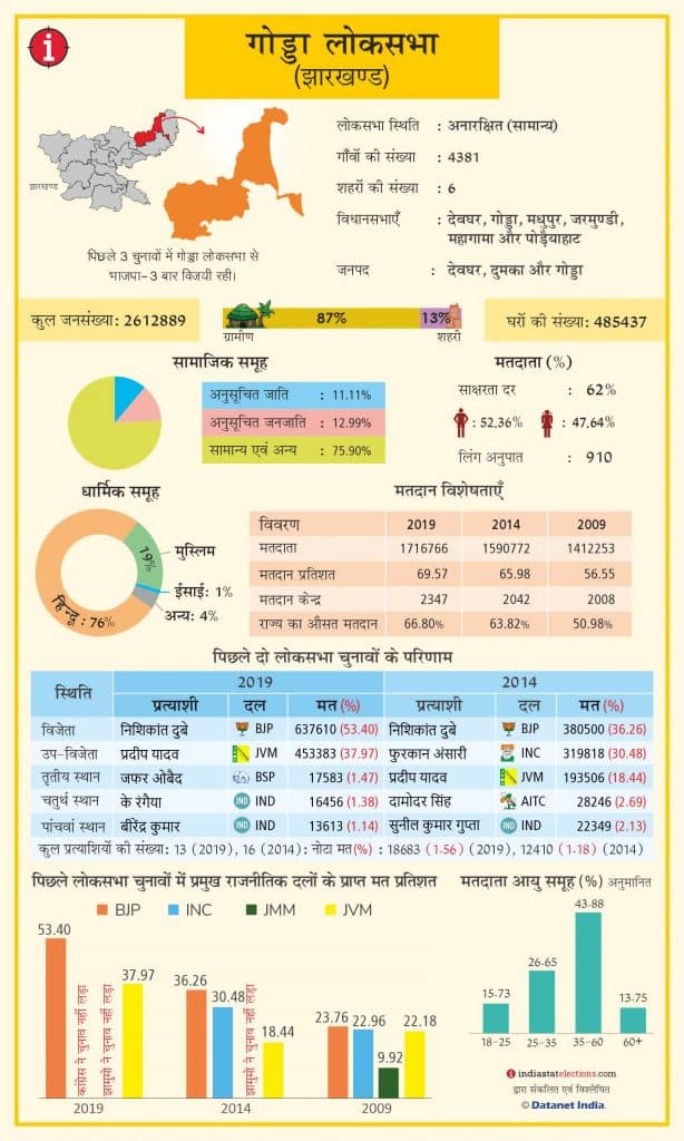 गोड्डा लोकसभा क्षेत्र में गांवों में रहने वाले आबादी की संख्या बेहद अधिक है. यहां के 87 प्रतिशत आबादी ग्रामीण इलाकों में रहती है. 13 प्रतिशत आबादी शहरों में रहती है. इस लिए गोड्डा सीट पर ग्रामीण मतदाताओं का दबदबा है.