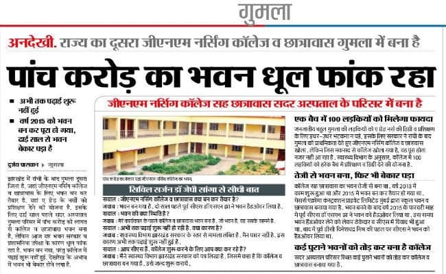 श्री लाल ने कहा कि अभी कुछ दिन पहले ‘प्रभात खबर’ में समाचार छपी है कि कॉलेज बेकार पड़ा है. यह पांच करोड़ रुपये का भवन है. खबर की जानकारी देते हुए श्री लाल ने कहा कि अगर कॉलेज शुरू कर नर्सिंग की पढ़ाई की जाये तो गुमला जिला के 100 लड़कियों को नर्सिंग का प्रशिक्षण मिल सकेगा. इससे लड़कियों को स्वास्थ्य के क्षेत्र में आगे बढ़ने का अवसर मिलेगा.
