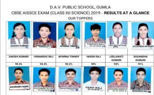 सीबीएसई 12वीं की परीक्षा में डीएवी गुमला के विद्यार्थियों ने एक बार पुनः उत्कृष्ट प्रदर्शन कर पूरे जिले में विद्यालय का का नाम रोशन किया है. लड़कियों का रिजल्ट सबसे बेहतर है. विज्ञान संकाय में साक्षी कुमारी 95.4 प्रतिशत अंक प्राप्त कर टॉपर रही है. वहीं कॉमर्स में सुंदरम प्रकाश सिंह 93 प्रतिशत अंक प्राप्त कर अव्वल रही. विद्यार्थियों की सफलता पर डीएवी के प्रधानाचार्य डीके महतो ने प्रसन्नता जाहिर करते हुए कहा है कि विद्यार्थियों के लगन, परिश्रम एवं शिक्षकों के मार्गदर्शन से यह सफलता प्राप्त हुई है.