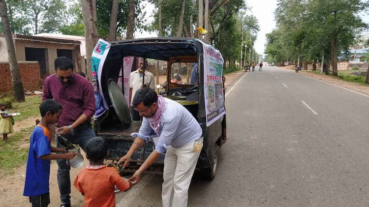 गुमला : गुरुकुल संस्थान के भोजन रथ से हर दिन करीब 800 लोगों की भूख मिट रही है. भोजन की गाड़ी पहुंचने से पहले ही हर उम्र के लोग कतार में खड़े हो जाते हैं. गुमला शहर से सटे आठ गांवों में 40 दिनों से गुरुकुल द्वारा गरीबों को भोजन कराया जा रहा है. खिचड़ी के साथ पुड़ी, सब्जी व आचार भी बांटा जा रहा है. बच्चों को दूध का पैकेट मिल रहा है.