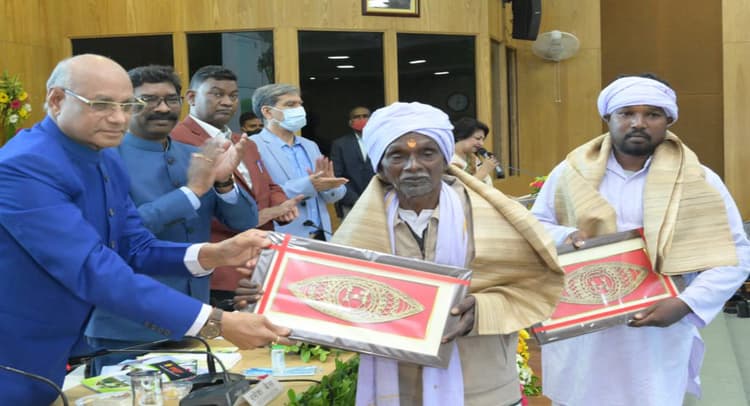 राजधानी रांची के धुर्वा स्थित झारखंड मंत्रालय (प्रोजेक्ट भवन) सभागार में राज्यपाल रमेश बैस और मुख्यमंत्री हेमंत सोरेन ने धरती आबा बिरसा मुंडा के वंशज सुखराम मुंडा व कान्हू मुंडा को सम्मानित किया.