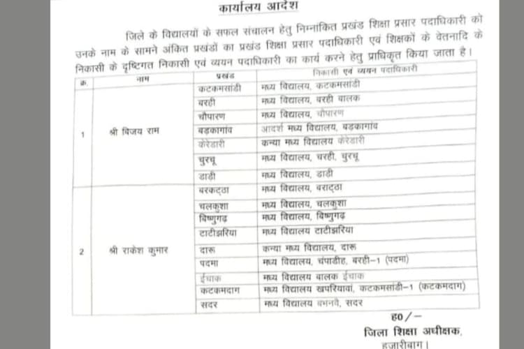 बीईईओ राकेश कुमार को बरकट्ठा, चलकुसा, विष्णुगढ़, टाटीझरिया, दारू, पदमा, इचाक, कटकमदाग और सदर प्रखंड मिला है. वहीं, बीईईओ विजय राम को कटकमसांडी, बरही, चौपारण, बड़कागांव, केरेडारी, चुरचू और डाड़ी प्रखंड मिला है.