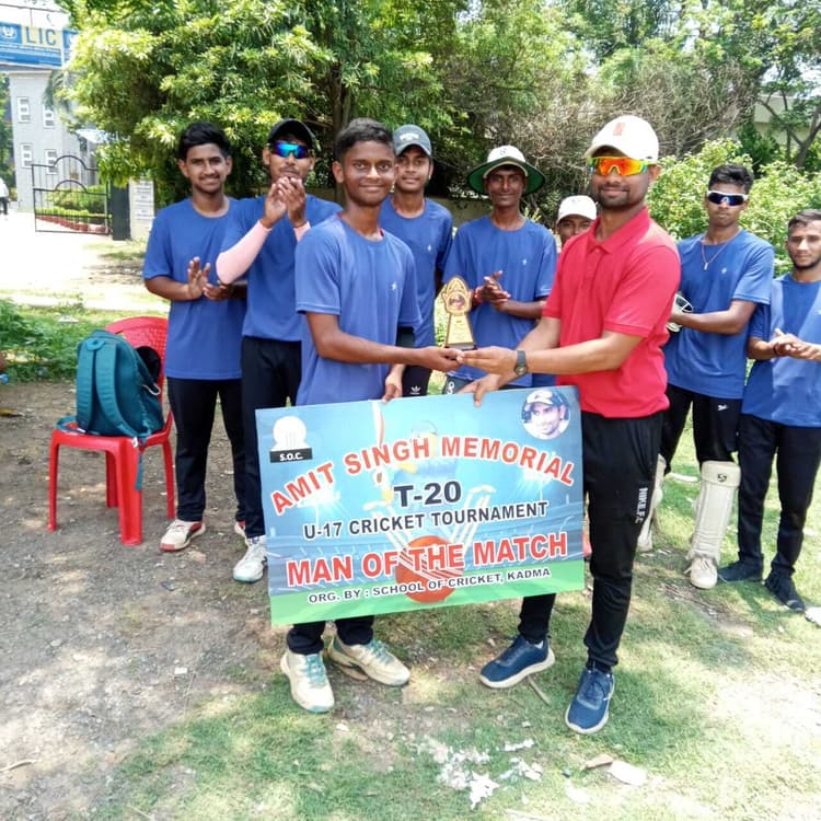 जमशेदपुर. कदमा लिंक रोड स्थित राजीव नायर क्रिकेट मैदान में आयोजित अमित सिंह मोमोरियल टी-20 टूर्नामेंट में मंगलवार को दो मैच खेले गये. पहले मैच में दलमा क्रिकेट एकेडमी की टीम ने सूरज ब्लास्टर्स को 62 रन से हराया. दलमा क्रिकेट एकेडमी की टीम ने पहले बल्लेबाजी करते हुए 20 ओवर में आठ विकेट पर 182 रन बनाए. यशदीप कुशाहा ने 59 व चीरंजीत ने 37 रनों की पारी खेली. जवाब में सूरज ब्लास्टर्स की टीम 20 ओवर में आठ विकेट पर 120 रन ही बना सकी. हितार्थ खिरवाल ने 30 रनों की पारी खेली. दलमा की ओर से ऑफ स्पिनर सुजल कुमार ने तीन विकेट लिये. परवीन को एक विकेट मिला. सुजल प्लेयर ऑफ द मैच बने. एक अन्य मैच में जमशेदपुर सुपर किंग्स की टीम ने शाह स्पोर्ट्स को नौ विकेट से मात दी. सुपर किंग्स की ओर से पांच विकेट लेने वाले लक्ष्य प्रकाश प्लेयर ऑफ द मैच बने. वकार अहमद राशिद ने 65 रनों की पारी खेली.