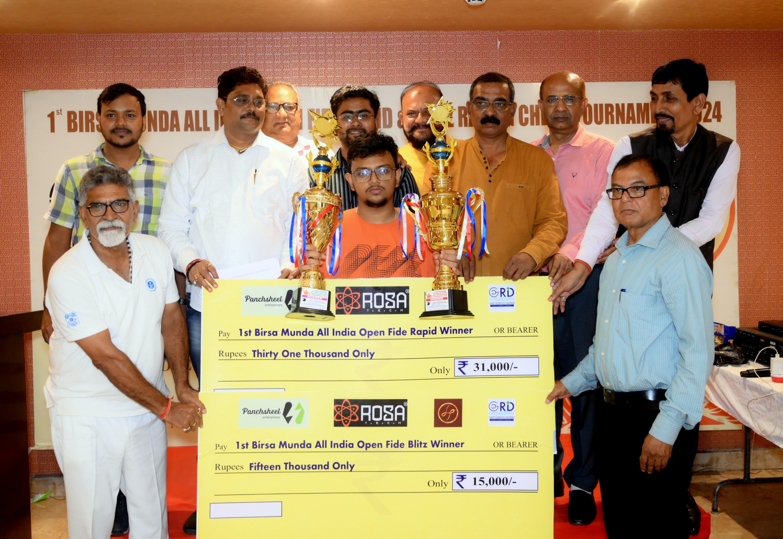 जमशेदपुर. सरायकेला-खरसावां जिला शतरंज एसोसिएशन की मेजबानी में गम्हरिया में आयोजित पहली बिरसा मुंडा ऑल इंडिया ओपन रैपिड व ब्लिट्ज फिडे रेटिंग चेस चैंपियनशिप संपन्न हो गया. बंगाल के मित्रभा गुहा ने दोनों वर्गों में बेहतरीन प्रदर्शन करते हुए खिताब अपने नाम किया. मित्रभा गुहा रैपिड वर्ग के 9 राउंड में कुल 8.5 अंक अर्जित करते हुए चैंपियन बने. उन्हें 31 हजार रुपये का नकद पुरस्कार दिया गया. ब्लिट्ज राउंड में मित्रभा गुहा ने कुल नौ अंक अर्जित करते चैंपियन बनने का गौरव हासिल किया. रैपिड वर्ग में बिहार के कुमार गौरव (8 अंक) दूसरे स्थान पर रहे. उन्होंने 21 हजार रुपये का पुरस्कार अपने नाम किया. वही, बंगाल के अनुस्तूप विश्वास तीसरे, बिहार के सुधीर कुमार सिन्हा चौथे व ओडिशा के जगदीश पांचवें स्थान पर रहे. इन लोगों को क्रमश: 15, 12 व 10 हजार रुपये का नकद पुरस्कार दिया गया. दूसरी ओर ब्लिट्ज में बंगाल के ग्रैंडमास्टर सप्तऋषि रॉय चौधरी उपविजेता रहे. उन्होंने 8 अंक बनाकर 10,000 रुपय नगद राशि अपने नाम की. बिहार के सुधीर सिन्हा तीसरे, कुमार गौरव चौथे व रंजीत मजूमदार पांचवें स्थान पर रहे. वही, रैपिड के 1400-1500 रेटिंग कैटेगरी में बंगाल के रेयांश जगनानी, 1500-1600 वर्ग में झारखंड के एस बनर्जी, 1600-1700 वर्ग में झारखंड के हर्ष कुमार झा, 1700-1800 वर्ग में ओडिशा के कर्जी मणींद्र विजेता घोषित किए गए. पुरस्कार वितरण समारोह में मुख्य अतिथि के रूप मे समाजसेवी शंभूनाथ सिंह, विशिष्ठ अतिथि अरुण पाठक, आशा सिंघानिया, संघ के संरक्षक एनके सिंह, अध्यक्ष मनोज कुमार, उपाध्यक्ष राजू चौधरी, विनोद कुमार सिंह, राज कुमार सिंह, शैलेन्द्र कुमार, सचिव अजय कुमार, एनके तिवारी, जयंत भुइंया, विशाल कुमार मिंज, झारखंड शतरंज संघ के संयुक्त सचिव दीपक कुमार व अन्य लोग मौजूद थे.