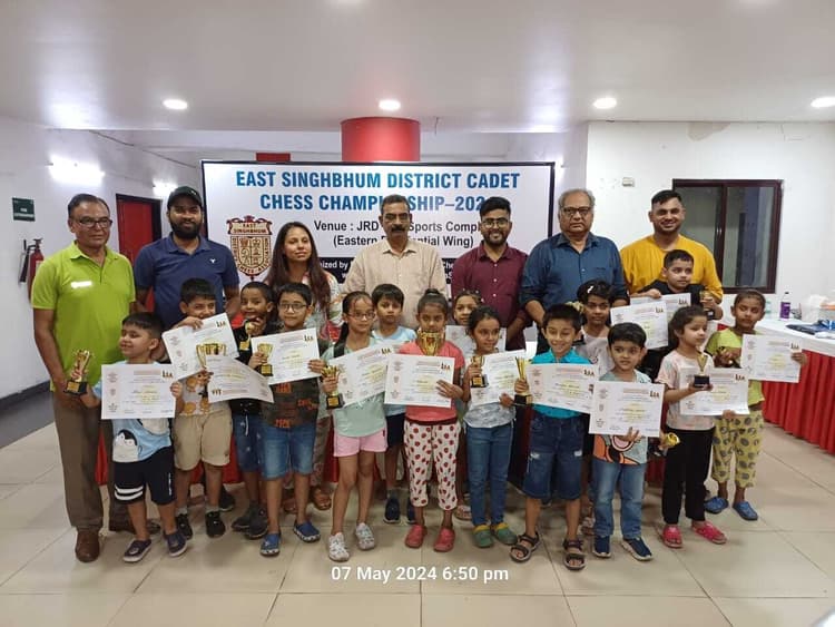 जमशेदपुर. जेआरडी टाटा स्पोर्ट्स कॉम्प्लेक्स में आयोजित जिला अंडर-7 ओपन चेस प्रतियोगिता के विजेता खिलाड़ियों को मंगलवार को पुरस्कृत किया गया. अंडर-7 बालिक वर्ग में टी निहारिका विजेता बनी. अनिशा कुमारी दूसरे स्थान पर रही. काइरा अग्रवाल तीसरे, टी नेहा चौथे, काव्या अग्रवाल पांचवें, अविष्का दुबे छठे, दिव्याना अग्रवाल सातवें, दियारा मेहता आठवें स्थान पर रही. बालक वर्ग में रिद्धान गोयल विजेता रहे. धारिया अग्रवाल दूसरे, आर्थव अडेसरा तीसरे, कुमार आदित्य चौथे, रिशिता खेतान पांचवें, विवान छठे, अविराज एन अग्रवाल आठवें, शौर्य नि:श्चय नौवें व युवराज तिवारी दसवें, कियान अग्रवाल 11वें और योहान एस इंद्रवेल 12वें स्थान पर रहे. सरायकेला-खरसावां जिला शतरंज एसो के अध्यक्ष मनोज कुमार, टाटा खेल विभाग की विभूति अडेसरा ने विजेताओं को पुरस्कृत किया. मौके पर अजय कुमार, एनके तिवारी, जयंंत भुइंया, मुख्य आर्बिटर चंदन कुमार प्रसाद, अमन चौबे व अन्य लोग मौजूद थे.