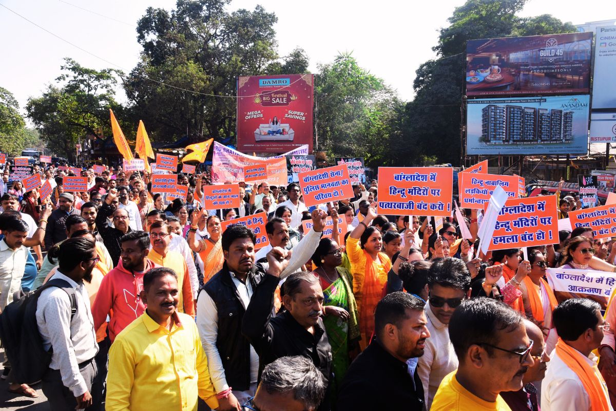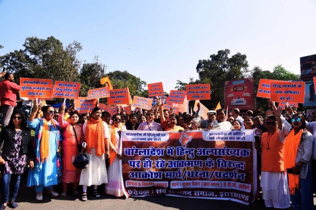 साकची के नेताजी सुभाष मैदान से उपायुक्त कार्यालय तक आक्रोश मार्च निकालकर बांग्लादेश के यूनुस सरकार और कट्टरपंथियों के खिलाफ जमकर नारेबाजी की. एडीएम के माध्यम से राष्ट्रपति व प्रधानमंत्री को ज्ञापन सौंप कर अल्पसंख्यकों की सुरक्षा में कड़े कदम उठाने की मांग की.