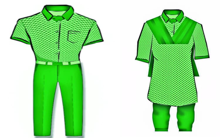 छह से आठवां : फुल पैंट एवं फुल शर्ट – हरा एवं सफेद चेक तथा हरे कलर सहित : सलवार एवं दुपट्टा-कुर्ता – हरा-हरा एवं सफेद चेक तथा हरे कलर सहित