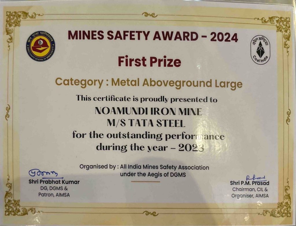 टाटा स्टील की नोवामुंडी आयरन माइन को मिला ‘माइंस सेफ्टी अवार्ड’ में प्रथम पुरस्कार