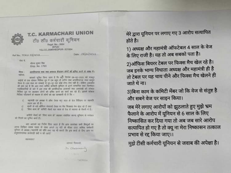 टाटा कमिंस कर्मचारी यूनियन के पूर्व सहायक सचिव धीरज सिंह यूनियन से छह साल के लिए निष्कासित है. आठ फरवरी 2023 को यूनियन अध्यक्ष और महामंत्री के खिलाफ सोशल मीडिया पर पोस्ट लिखने का आरोप में धीरज को शो-कॉज कर 72 घंटे में जवाब मांगा गया था. उन पर आरोप लगा था कि संगठन में रहकर किसी के बारे में अभद्र कहना या आपत्तिजनक बयानबाजी यूनियन विरोधी गतिविधि में शामिल है. नोटिस का जवाब तय समय सीमा में नहीं मिलने पर धीरज सिंह को छह साल के लिए यूनियन की सदस्यता से निलंबित कर दिया गया.अब पोस्टर लगाकर धीरज सिंह फिर चर्चा में है. पोस्टर में लिखा है कि मुझे टीसी कर्मचारी यूनियन से जवाब की अपेक्षा है. अब जब सारे आरोप सत्यापित हो गये, तो मेरा निष्कासन तत्काल प्रभाव से रद्द किया जाये. यह तो अब सबको पता है कि अध्यक्ष, महामंत्री ऑफ टेबुल चार साल के वेज के लिए राजी है. ऑफिस बियरर टेबल पर फिक्स मैच खेल रहे हैं. बिना काम के कमेटी मेंबर जो कि वेज से संतुष्ट हैं और सबने वेज पर साइन किया. धीरज का कहना है कि जब उनके खिलाफ लगाये गये आरोप झूठलाते हुए मुझे भ्रम फैलाने के आरोप में छह साल के निष्कासित किया गया. मुझे टीसी कर्मचारी यूनियन से जवाब की अपेक्षा है. इस संबंध में यूनियन नेतृत्व या कंपनी प्रबंधन की ओर से कोई प्रतिक्रिया नहीं मिली है.डिस्क्लेमर: यह प्रभात खबर समाचार पत्र की ऑटोमेटेड न्यूज फीड है. इसे प्रभात खबर डॉट कॉम की टीम ने संपादित नहीं किया है
