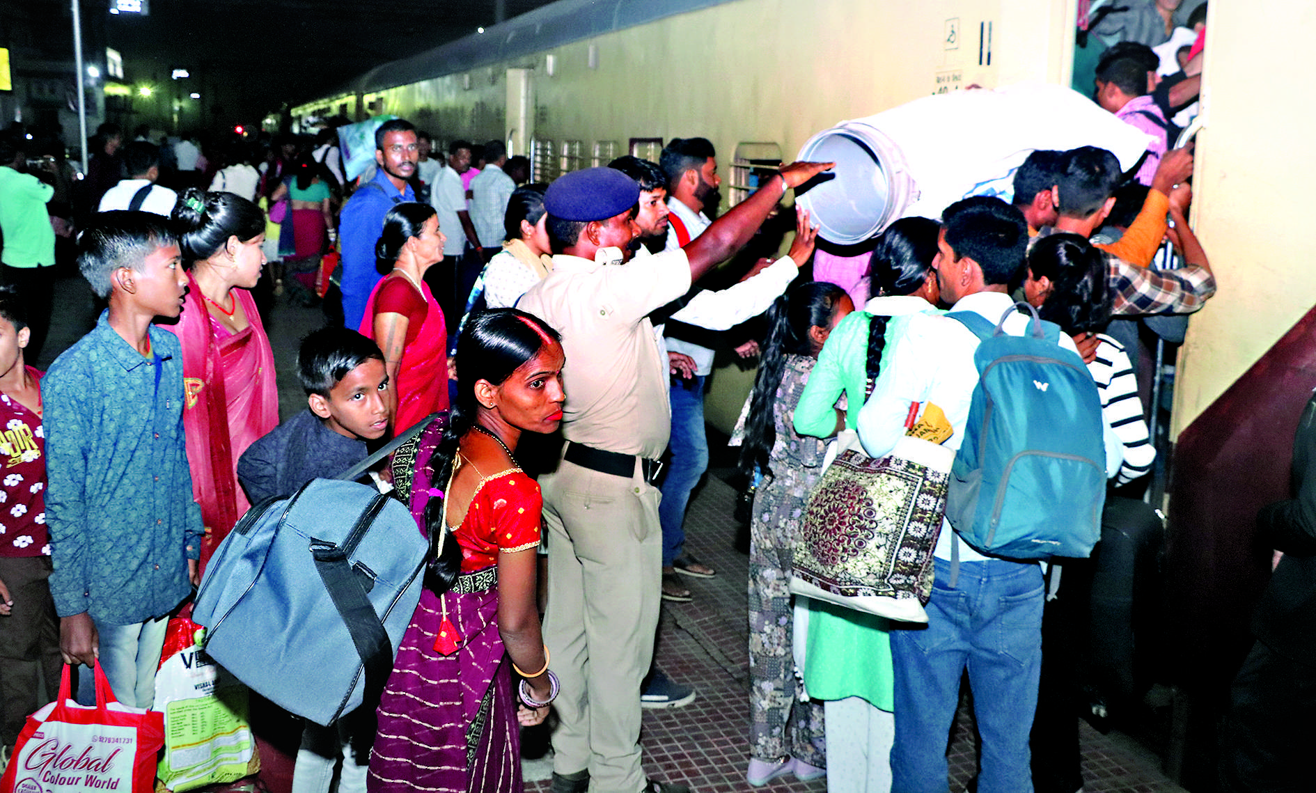 छठ पर्व को लेकर बिहार जाने वालों की भीड़ शनिवार को टाटानगर स्टेशन पर चरम पर दिखी. साप्ताहिक अवकाश के साथ रविवार, सोमवार और मंगलवार को त्योहार होने के कारण लोगों का घर वापसी का सिलसिला जारी रहा. टाटा से साउथ बिहार एक्सप्रेस और टाटा-कटिहार ट्रेन खुलने के दौरान भीड़ उमड़ पड़ी. ट्रेन पर चढ़ने की आपाधापी में प्लेटफॉर्मों पर अफरा-तफरी का माहौल बन गया. जनरल डिब्बों में एक-एक ट्रेन में करीब 600 से 800 यात्रियों ने किसी तरह अपनी जगह बनायी. आरपीएफ और जीआरपी ने लाइन लगवाकर यात्रियों को ट्रेनों में चढ़ाने की कोशिश की, पर भीड़ इतनी ज्यादा थी कि धक्का-मुक्की नहीं रुकी. पहले से ही यात्रियों से भरी ट्रेनों में सीट पाने की कोशिश में यात्री भागा-भागी करते नजर आये.स्टेशन के पूछताछ केंद्र पर भी लोगों की लंबी कतारें लगी रहीं. प्लेटफॉर्म संख्या 1-2, 3-4 और 5 पर भीड़ रही. रेलवे की तरफ से लाउड स्पीकर से यात्रियों को सतर्क किया जा रहा था. कुछ यात्री ऐसे भी थे, जो जगह के लिए दूसरी ट्रेन में भी बैठे नजर आये. उनका कहना था कि पास के स्टेशन के घर चले जायेंगे. अपने स्टेशन पर जाने वाली ट्रेन के चक्कर में रहेंगे, तो जगह ही नहीं मिल पायेगी. बिहार की लगभग सभी ट्रेनों में जनरल से लेकर स्लीपर कोच तक में ठसाठस भीड़ है. हालात ऐसे रहे कि “जहां जगह मिली, वहीं लोग खड़े हो गये.” सबसे ज्यादा परेशानी छोटे बच्चों और महिलाओं के साथ सफर करने वालों को झेलनी पड़ी.