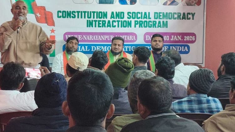 मुरलीपहाड़ी. नारायणपुर में सोशल डेमोक्रेटिक पार्टी ऑफ इंडिया के बैनर तले संविधान और सामाजिक लोकतंत्र विषय पर संवाद का आयोजन हुआ. अध्यक्षता जामताड़ा जिलाध्यक्ष जैनुल आबेदीन ने की. इस अवसर पर झारखंड प्रभारी अब्दुल सलाम एनयू, प्रदेश अध्यक्ष मो हंजेला शेख, प्रदेश महासचिव तहमीदुर रहमान तथा प्रदेश कमेटी सदस्य गुलाम रसूल उपस्थित रहे. जिला सचिव मुरताज अंसारी ने कार्यक्रम की रूपरेखा, उद्देश्य की जानकारी दी. प्रदेश कमेटी सदस्य गुलाम रसूल ने स्वागत भाषण दिया. प्रदेश महासचिव तहमीदुर रहमान ने संविधान की मूल भावना, सामाजिक न्याय और लोकतांत्रिक मूल्यों पर विस्तार से प्रकाश डाला. कहा कि संविधान सभी नागरिकों को समान अधिकार और सम्मान प्रदान करता है. प्रदेश अध्यक्ष मो हंजेला शेख ने कहा कि वर्तमान में संविधान, समानता और सामाजिक लोकतंत्र की रक्षा के लिए एसडीपीआइ की भूमिका अत्यंत महत्वपूर्ण है. झारखंड प्रभारी अब्दुल सलाम ने संविधान और सामाजिक लोकतंत्र पर प्रभावशाली विचार रखा. कहा कि लोकतंत्र की मजबूती के लिए जागरूक नागरिकों की भूमिका निर्णायक होता है.