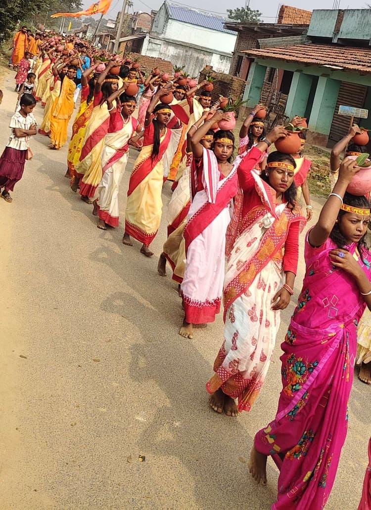 प्रतिनिधि, बिंदापाथर. बिंदापाथर गांव में आयोजित सात दिवसीय भागवत कथा सह भारत माता मेला को लेकर मंगलवार को भव्य कलश यात्रा निकाली गयी. पंडित हिमांशु चटर्जी, राजीव चटर्जी व सुमन चटर्जी के घाट पूजन एवं देव-देवियों के आवाहन के साथ 351 कन्या व महिलाएं बिंदापाथर जलाशय से कलश में जल भरकर बिंदापाथर गांव का भ्रमण करते हुए भागवत स्थल पहुंचे. इस दौरान वैष्णव श्रद्धालुओं ने हरे कृष्ण हरे कृष्ण कृष्ण कृष्ण हरे, हरे राम हरे राम राम हरे हरे, जय भारत माता, जय श्री कृष्ण के जयकारे लगाये. कलश स्थापना के पश्चात कलश धारी, वैष्णव व नर नारायण सेवा का आयोजन किया गया. इसके साथ ही बिंदापाथर में श्रीमद्भागवत कथा सह भारत माता मेला मंगलवार से प्रारंभ हो गया. नवद्वीप धाम के मशहूर कथावाचक मुकुंद दास अधिकारी भागवत पाठ करेंगे. भागवत कथा के आयोजन से बिंदापाथर, गबरापेटिया, महुलबना, माधवा, तिलाकी, मुरहम, मंझलाडीह, पुतुलजोड़, चड़कादह गांव में भक्ति का माहौल है. भागवत मैदान में विभिन्न देव-देवियों की प्रतिमा स्थापित की गयी है. मेले में मीना बाजार, तरह-तरह के झूले, ब्रेक डांस आदि का आनंद उठाने के लिए तमाम इंतजाम किए गए हैं.